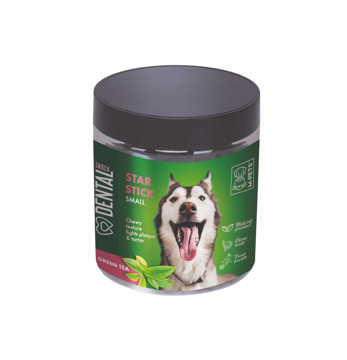 M-PETS Green Tea Star Stick Small, köpeğinizin ağız sağlığını korurken çiğneme anlarını keyifli hale getirir.